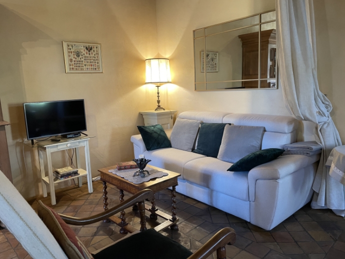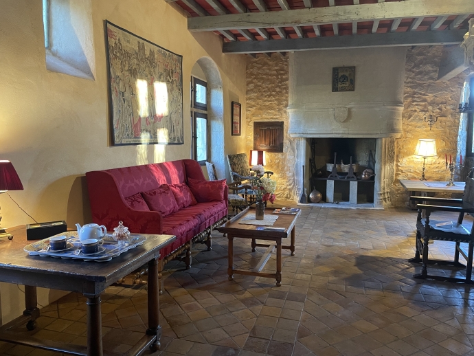The private entrance with guests toilet leads to the large living room (60sqm) with a medieval fireplace